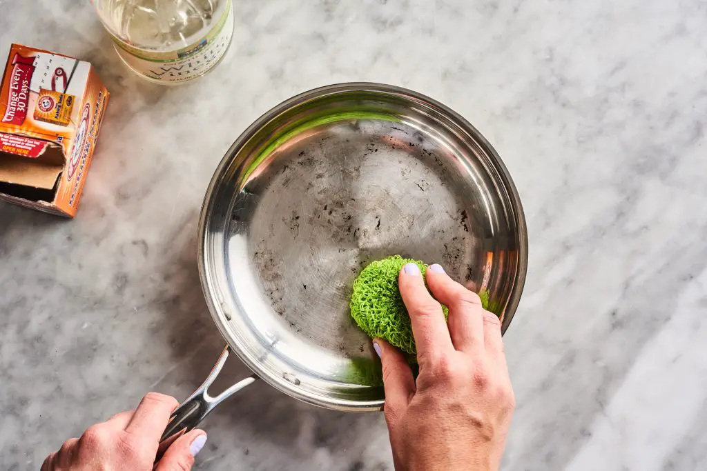 Fill your pan with a tablespoon of baking soda, add a splash of vinegar, and finally add some lukewarm water up to the burnt parts.